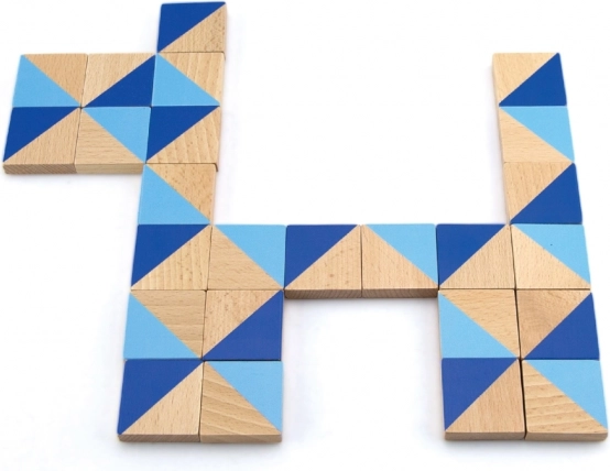 Pestre geometrijske ploščice v modrih odtenkih in naravnem lesu omogočajo sestavljanje neštetih likov in vzorcev.