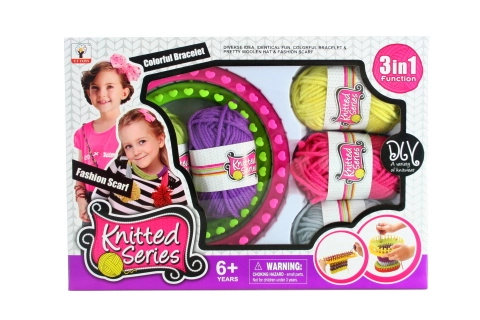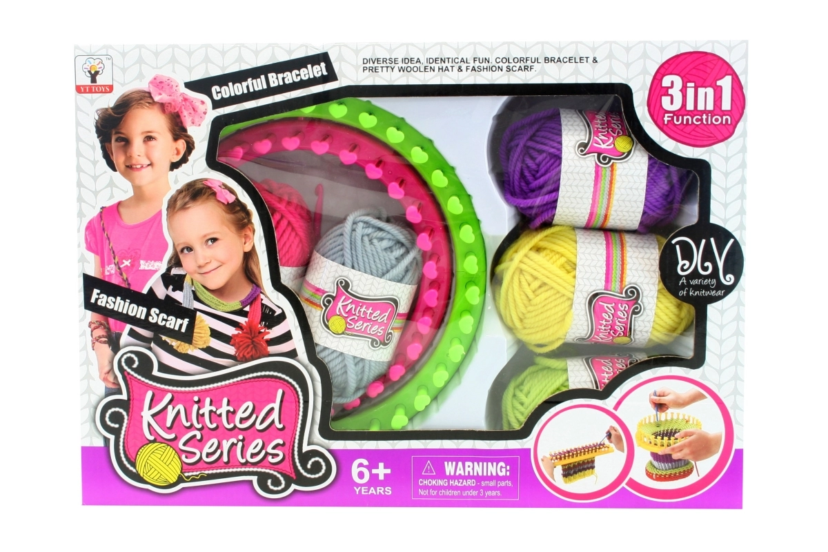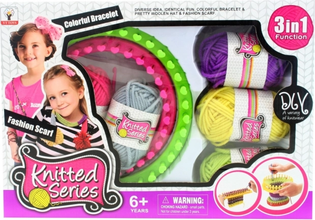 Ustvarjalni pletilni komplet za otroke 6+. Vsebuje 5 klobčičev volne, 2 statvi (21 in 17 cm), kavelj in navodila. Ustvarite šal, kapo ali ogrlico.
