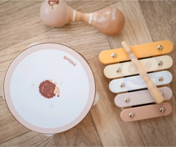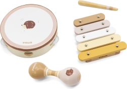 Ta stilski otroški komplet združuje varno leseno izvedbo z harmoničnim dizajnom POLARB z motivom ježka. Otroci lahko odkrivajo ritem na tamburinu, igrajo preproste melodije na ksilofonu in urijo koordinacijo z marakami. Idealno za prve glasbene korake doma in v vrtcu.