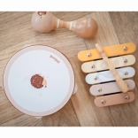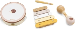 Komplet vsebuje tamburin, ksilofon s paličico in marake – vse v kompaktni velikosti za otroške roke.