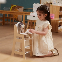 Vključen je praktičen pladenj, s katerim lahko otroci punčke udobno posadijo in jih “nahranijo” – idealno za razvoj domišljije in socialnih veščin.