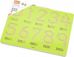 Ta kakovostna lesena tabla z vrezanimi številkami 0–9 je idealen pripomoček za prve korake v pisanje. Otrok z lesenim peresom sledi ukrivljenim utorom s smernimi puščicami ter si tako utrjuje pravilen oblikovni zapis številk, ritem in spominske sledi za lažji prehod na pisanje s svinčnikom.