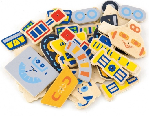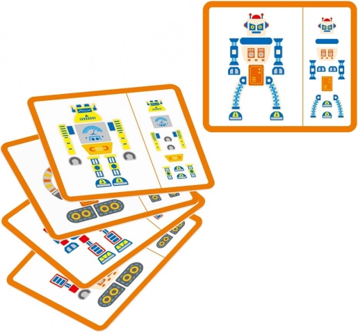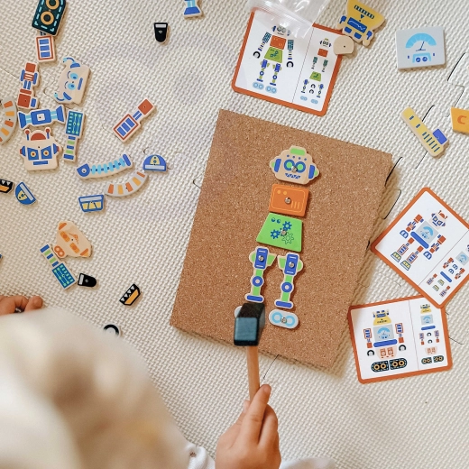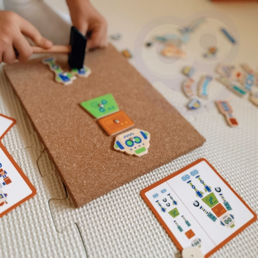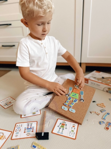 Priložene so instrukcijske karte z 10 predlogami robotov, ki pomagajo pri prepoznavanju oblik, koordinaciji oko–roka in potrpežljivosti. Otroci lahko ustvarjajo po predlogah ali povsem svobodno, kar podpira kreativno razmišljanje in samostojnost.