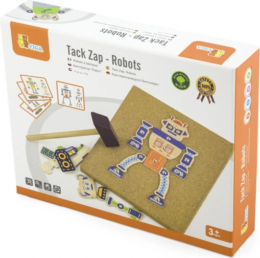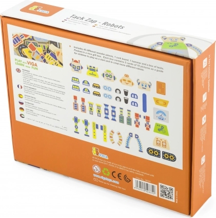 Odkrijte zabavno in izobraževalno igro za male graditelje – leseno pribijanko VIGA z motivom robotov. Set vsebuje 45 barvnih lesenih delov, korkasto ploščo, leseno kladivce, žebljičke in karte z predlogami. Otroci razvijajo fino motoriko, logično mišljenje, koncentracijo in kreativnost, ko na ploščo pritrjujejo oblike po domišljiji ali po vzorcih.