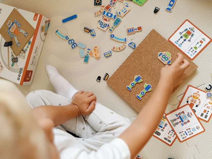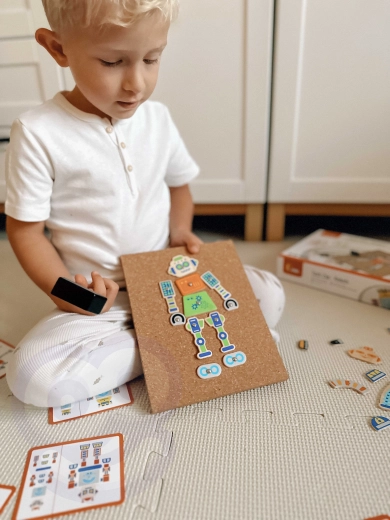 Karte z 10 vzorci pomagajo pri začetku, prava zabava pa se začne pri svobodnem ustvarjanju. Otroci si sestavijo svoje robote ter vadijo domišljijo in načrtovanje.