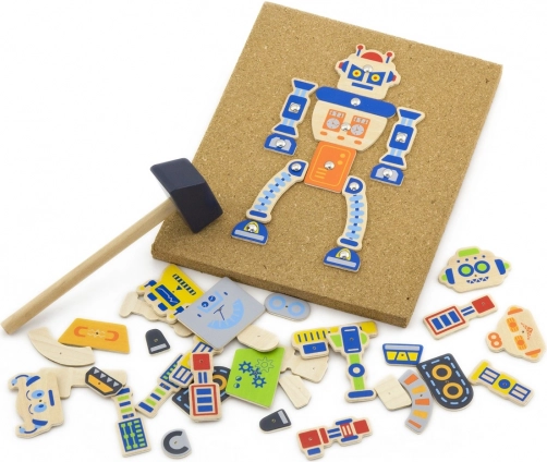 Ta kreativna pribijanka z roboti je idealna izbira za otroke od 3 let. Vsak leseni del ima predvrtano luknjo za enostavno in varno pritrjevanje z žebljički. Zaobljeni robovi in kakovostna izdelava zagotavljajo varno igro in dolgo življenjsko dobo igrače.