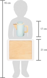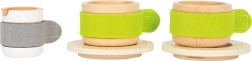 Doživite veselje ob pripravi čaja in kave z našim igralnim setom. Ta lepo izdelan lesen set ponuja številne podrobnosti, ki spodbujajo domišljijo. Set vključuje dve skodelici s krožničkoma, dve žlički, posodico za sladkor, vrček za mleko in velik čajnik ali kavnik s snemljivimi pokrovi, ki povečajo realističnost igre.