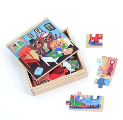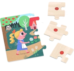 Štiri samostojne sestavljanke s po 9 koščki korak za korakom pripovedujejo pravljico o Zlatolaski ter spodbujajo otroško domišljijo in pripovedovanje.