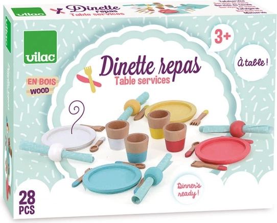 Ta lesen jedilni set prinaša otrokom pristno izkušnjo domače kuhinje. Barviti krožniki, kozarčki, žličke, vilice in noži skupaj s servietami in prstani navdihujejo domišljijsko igro, razvijajo fino motoriko ter spodbujajo sodelovanje in komunikacijo med otroki.
