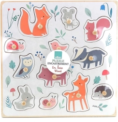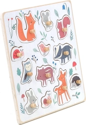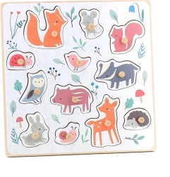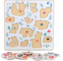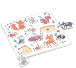 Ta kakovostna lesena vstavljanka z motivi gozda je nastala v sodelovanju z ilustratorko Sarah Betz in otrokom prinaša veselje do odkrivanja. Barvne pike na podlagi nežno nakažejo, kam sodi posamezen košček, ter spodbujajo osredotočenost in logično mišljenje. Zahvaljujoč trdnim lesenim ročajem otroci vadijo pravilen prijem in razvijajo fino motoriko.