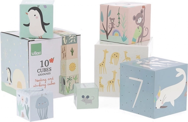 Kocke so izdelane iz kakovostnega, lahkega in trpežnega kartona. Zaradi postopno manjših velikosti se zlahka zlagajo druga na drugo ali vstavljajo, zato prihranijo prostor in so idealne tudi za na pot. Dizajn Sarah Betz poudarja igrivost ter podpira domišljijo in zbranost.