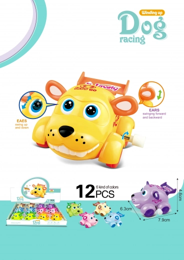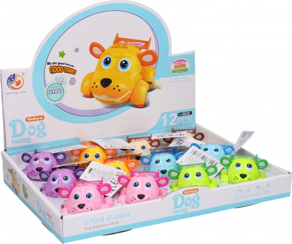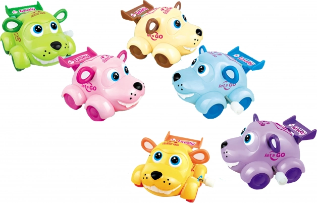 Ljubek igrači kuža na vzmetni pogon iz plastike, velik 8 cm, idealna igrača za majhne otroke. Preprosto ga navijte in opazujte, kako se premika.