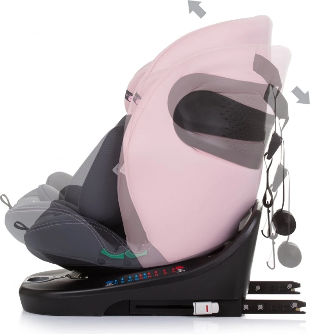 Univerzalni otroški avtosedež za višino 40–150 cm z ISOFIX, Top Tether in 360° vrtljivo osnovo za enostavno posedanje otroka. Ponuja vožnjo nasproti in v smeri vožnje, 5-točkovne pasove, zaščito pred bočnim trkom ter udobno oblazinjenje vključno s 3D vložkom. Odobreno po standardu R129 i-Size za varna potovanja od rojstva do približno 12 let.