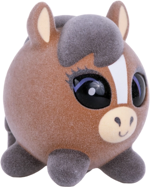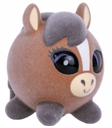 Hira je rjave barve z belim pasom na čelu in velikimi, prijaznimi očmi, zaradi česar je igrača zelo privlačna za malčke.