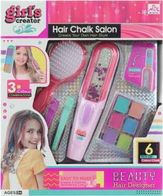 Komplet za male frizerke. Pakiranje vsebuje krede za lase, aplikator, krtačo za lase in dva sponki. Zapakirano v škatli. Približne dimenzije pakiranja: 26 × 31 × 6 cm. Starost 5+