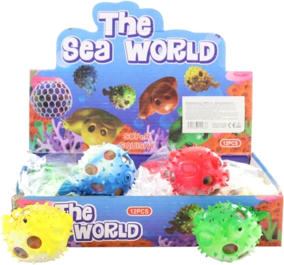 Antistresna stiskalna žogica v obliki napihnjenca, iz katere pri stiskanju priteče masa. Velikost približno 9 × 5 × 6 cm. Pakirano v vrečki. Starost 3+.