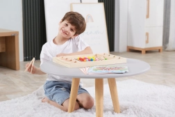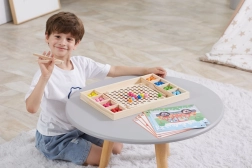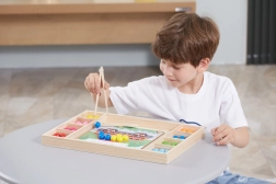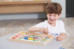 Lesena izobraževalna igra "Ujemi in razvrsti" otrokom omogoča preizkušanje različnih vzorcev in barv po priloženih listih ali lastni domišljiji. Pri tej igri lahko otroci pritrdijo papir na lesen pladenj ter z uporabo paličk, žličke ali sponke vstavljajo barvne kroglice v odprtine na plošči. Na koncu lahko ustvarijo čudovite slike.
