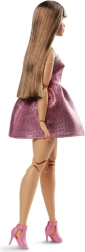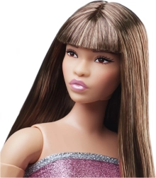 Punčka Barbie ima gladke rjave lase z ravno frufrujem, izrazite obrvi in sijoč make-up, ki dopolni njen videz.