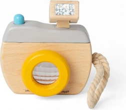 Izrazit objektiv, zgornja »bliskavica« in funkcijski gumb otrokom prinašajo avtentično izkušnjo fotografiranja. Kakovosten les in zaobljeni robovi zagotavljajo varno igro brez ostrih delov.