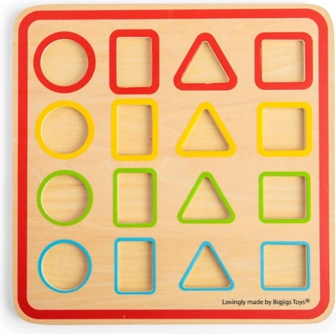 Set vsebuje trdno osnovno ploščo in 16 lesenih delov različnih oblik in barv. Kompaktna mera plošče 25 × 25 × 0,9 cm je primerna za otroško mizo in za na pot, hkrati pa omogoča enostavno pospravljanje.