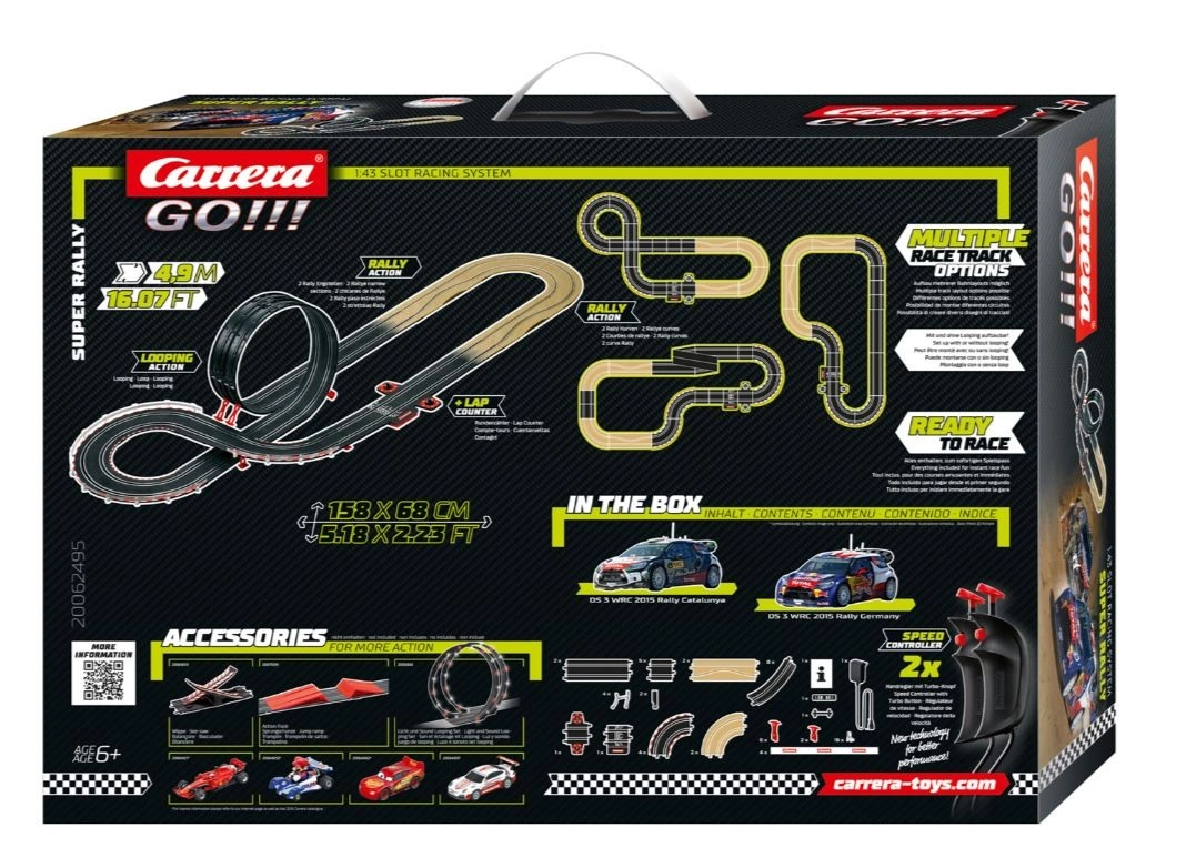 Zavoji, zanka in dolge ravnine – dirkalna steza CARRERA GO!!! Super Rally dolžine 4,9 m bo preizkusila vaše sposobnosti. Visoka hitrost, ostri manevri in adrenalinska vožnja niso za začetnike. Kdo bo prvi prečkal ciljno črto?