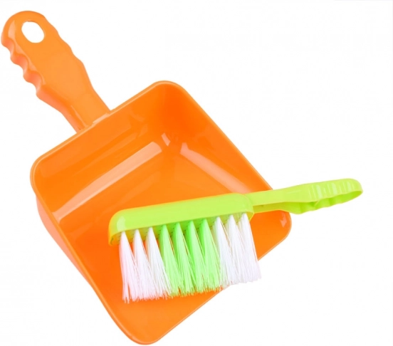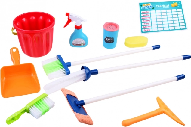 Popolna oprema z vedrom, mopom, ročno metlico, smetišnico, krtačo, gobico in drugimi dodatki za realistično igro pospravljanja.