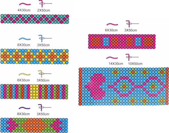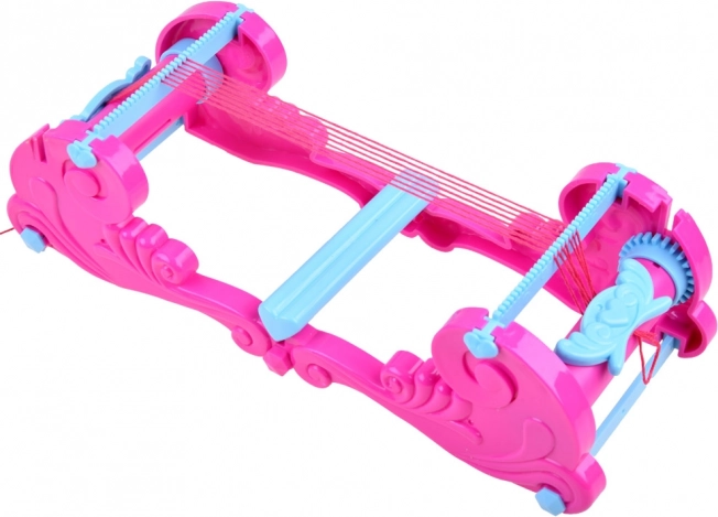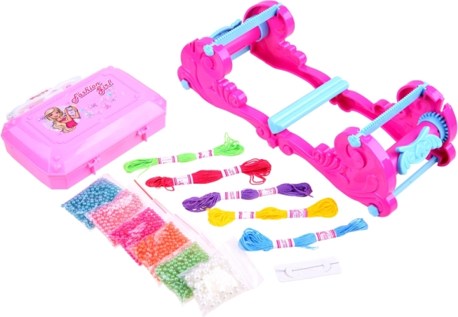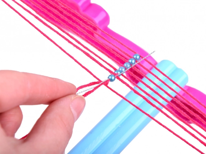 Rožnato-modre statve držijo niti trdno na mestu ter omogočajo udobno nizanje biserčkov in enakomerne vzorce.
