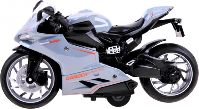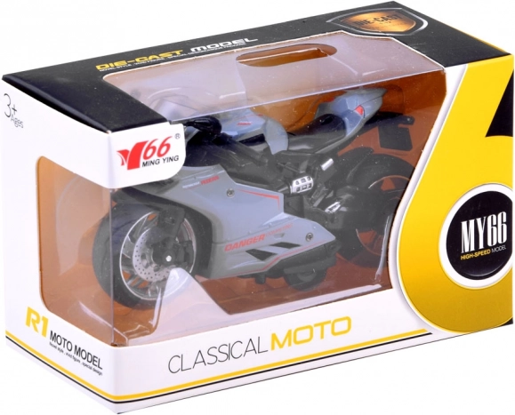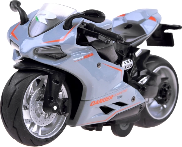 Motocikel z napenjalnim sistemom je igrača za vsakega malega in velikega ljubitelja vozil na dveh kolesih. Dirkač je izdelan iz kovine s plastičnimi detajli. Velika kolesa z gumijastimi pnevmatikami izboljšujejo oprijem. Bonus je blažilnik v zadnjem kolesu. Motorno kolo se vozi po napenjanju vzmetnega sistema. Preprosto postavite motorno kolo na ravno površino, ga potegnite nazaj in izpustite! Dirkač se bo zapeljal naprej! Realistično reproducirano motorno kolo tipa dirkač zagotavlja veliko zabave vsakemu otroku. Motorno kolo je zelo skrbno in estetsko izdelano.