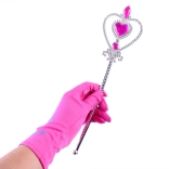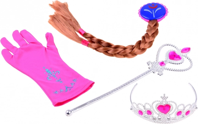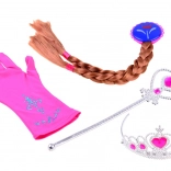 Temno modra okrasna sponka za lase s pritrjenimi dolgimi kostanjevimi kitkami se enostavno namesti in vam predvsem pomaga, da postanete podobni lepi princese iz priljubljene pravljice. Krona in žezlo sta nujna dodatka za vsako kraljico, princeso ali princeso, zato so bili skrbno izdelani in lepo okrašeni z rožnatimi plastičnimi kristali. Rožnata rokavica z lepim elegantnim okrasjem lepo dopolni videz male deklice.