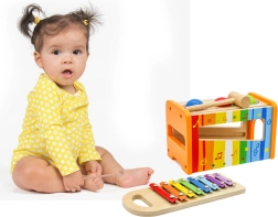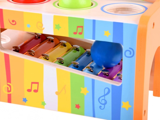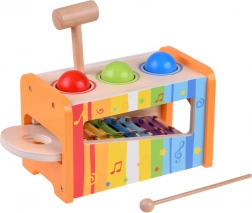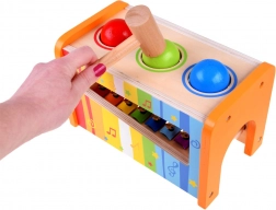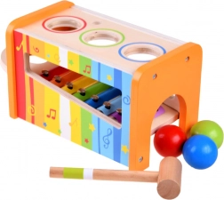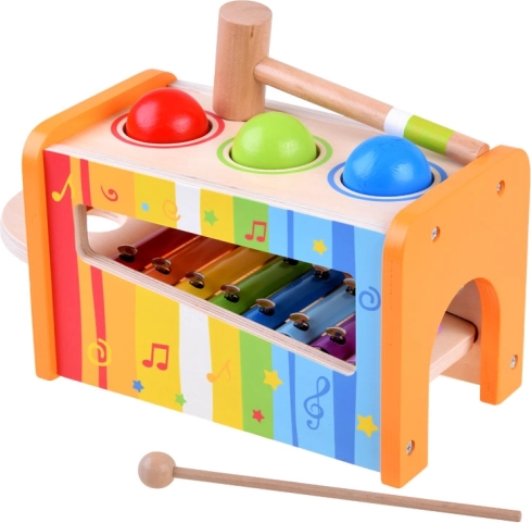 Otroci lahko s kladivcem zabijajo barvite kroglice skozi odprtine v konstrukciji, ki ob padcu na ksilofon ustvarjajo različne zvoke. Ta dejavnost razvija motorične spretnosti in glasbeno zaznavanje.