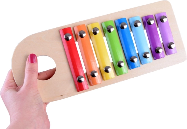 Ksilofon je barvno zasnovan tako, da pritegne pozornost otrok in jih spodbuja k raziskovanju zvokov.