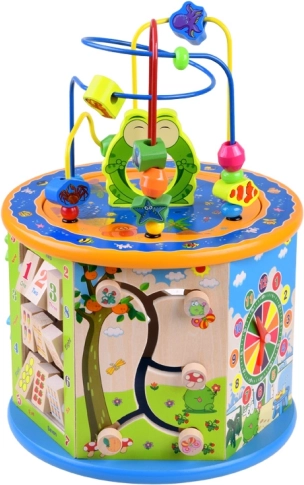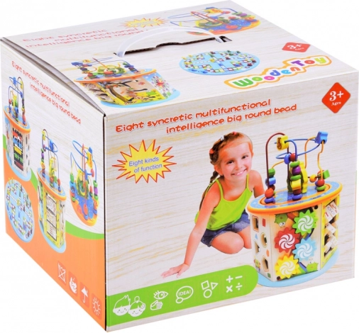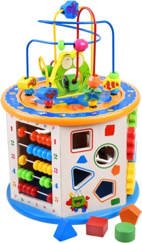 Ta lesena izobraževalna kocka ponuja širok nabor aktivnosti, ki bodo vašemu otroku pomagale osvojiti nove spretnosti in znanje. Vključuje številne funkcije, med drugim labirint z barvnimi kroglicami, barvno abako in vstavljanje oblik. Vsi elementi so zasnovani za majhne otroške roke, kar zagotavlja varno in udobno igro.