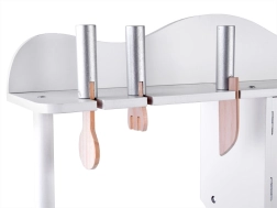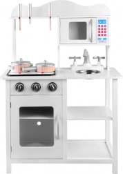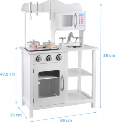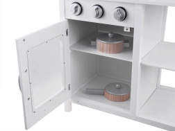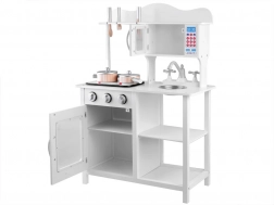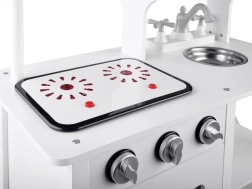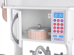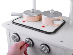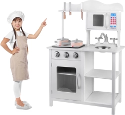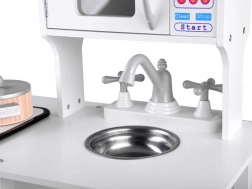 Ta elegantna bela kuhinjica iz lesa in MDF otrokom prinaša realističen doživetje kuhanja. Interaktivna kuhalna plošča posnema vrelo vodo s svetlobnimi in zvočnimi učinki, vrtljivi gumbi prijetno »klikajo«, kovinska posoda v koritu pa se za udobno čiščenje preprosto odstrani. Kakovostni materiali in površina z nestrupenimi barvami zagotavljajo varno in vzdržljivo igračo.