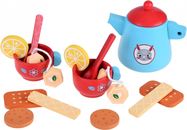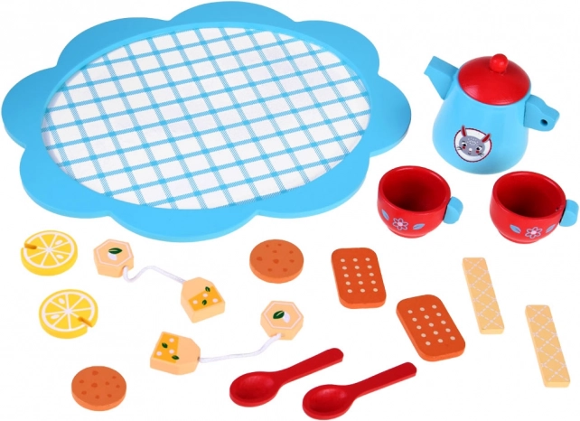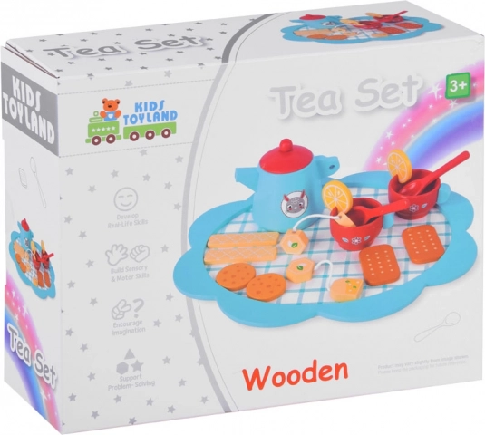 Ljubek lesen čajni set za otroke v modrih odtenkih prinaša vse za majhno čajno zabavo: pladenj, čajnik, skodelice, žličke ter piškote in limono. Izdelan je iz trpežnega lesa in prebarvan z varnimi, netoksičnimi barvami, zato je idealen za igranje vlog, razvoj domišljije in fino motoriko otrok od 3 let dalje.