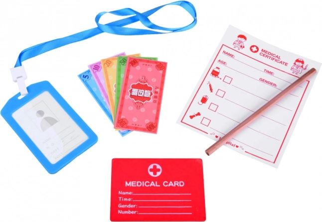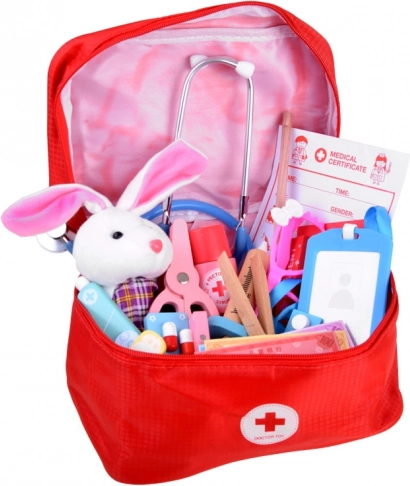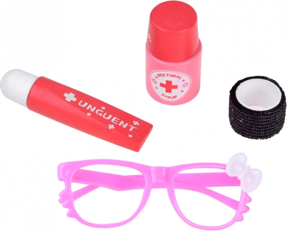 Sestavni del je tudi termometer z izmenljivimi diski, brizga, škarje, pinceta, povoj, obliži, “zdravila” v pastilah in kapsulah (rekviziti), sirup in mazilo v tubi, kartice pacienta ter zdravniška izkaznica. Vse se preprosto pospravi v trpežno rdečo torbico z ročajem, zato je komplet idealen tudi za na pot in za hitre posege.