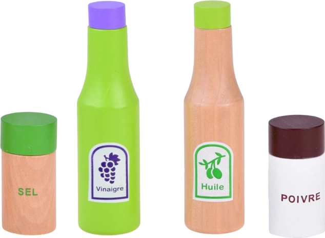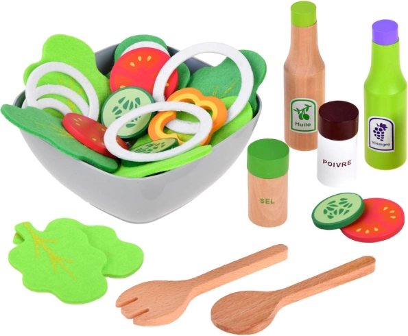 Tekstilni lističi zelenjave, lesene začimbnice in servirna žlica omogočijo otrokom pripraviti »pravo« solato ter razvijati domišljijo pri kuhinjski igri.