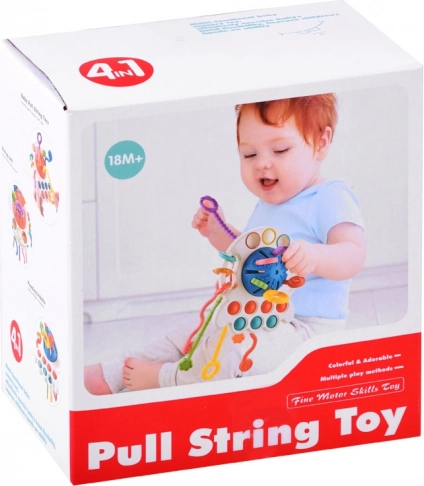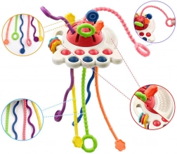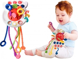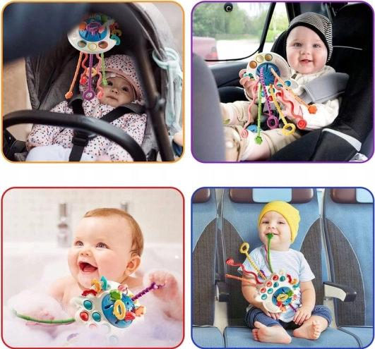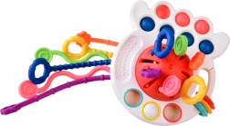 Posebej oblikovano grizalo je opremljeno z šestimi teksturiranimi strunami, ki ob vlečenju skozi odprtine proizvajajo različne zvoke in vibracije. Ta funkcija pomaga vaditi otroški prijem in razvija motorične sposobnosti.