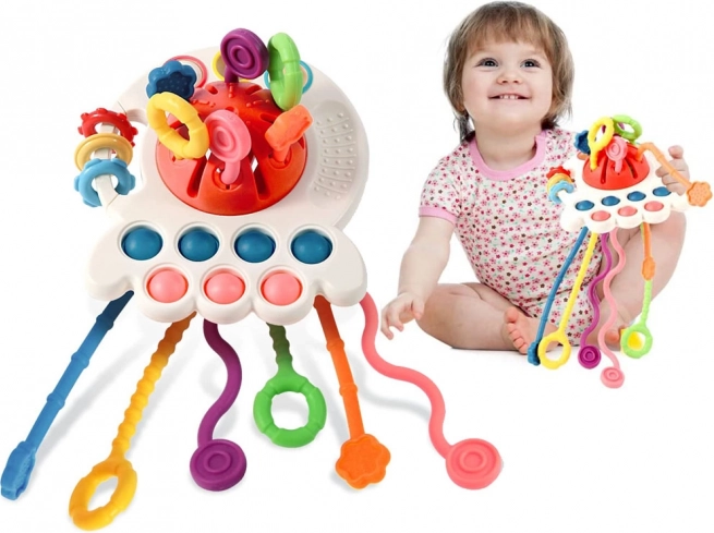 Vsebuje mehke gumbe in tri plastične obročke, ki otroku nudijo raznolike otipne izkušnje.