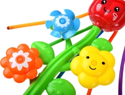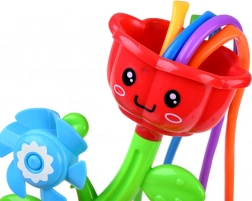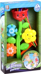 Barvna plastična zasnova z veselimi rožicami, ki se vrtijo ob pretoku vode, omogoča interaktivno igro.