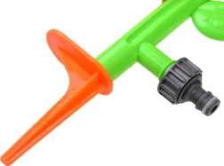 Ta škropilnik je izdelan iz kakovostne plastike v živih barvah, kar zagotavlja trpežnost in dolgo življenjsko dobo. Z univerzalnim priključkom lahko hitro in enostavno priključite poljubno vrtno cev. Namestitev v travo je enostavna zahvaljujoč konici na koncu škropilnika.