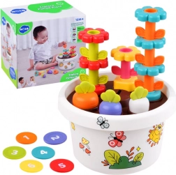Vsak del igrače ponuja različne možnosti, kako se lahko otroci naučijo osnovnih barv in oblik. Vse dele je mogoče enostavno pospraviti v cvetlični lonček, kar prihrani prostor in ohranja red.