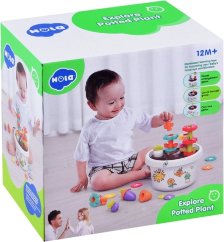 V središču osnove cvetličnega lončka je odprtina za vstavljanje žetonov, kar izboljšuje koordinacijo rok in oči. Set vključuje tudi barvite nalepke za okraševanje cvetličnega lončka, s čimer se razvija kreativnost otrok.