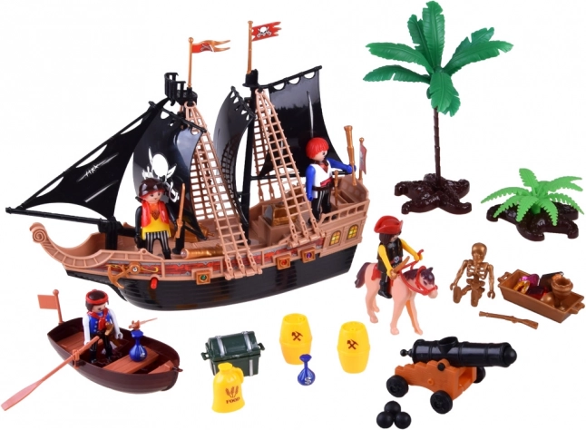 Podajte se na pustolovščino po odprtem morju s tem bogato opremljenim piratskim kompletom. Velika ladja s črnimi jadri ima skrita kolesca za preprosto premikanje in gumb, ki sproži svetlobne in zvočne učinke. Ne manjka streljajoči top s kroglicami, 4 figurice, čoln, zakladi in veliko dodatkov za kreativno igro že od 3. leta dalje.