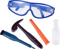 Dleto, kladivce, čopič, razpršilnik in zaščitna očala – popolna oprema za male raziskovalce, ki spodbuja fino motoriko in koordinacijo.