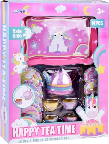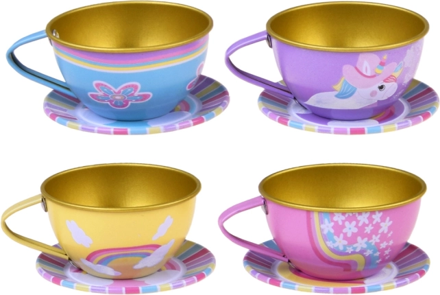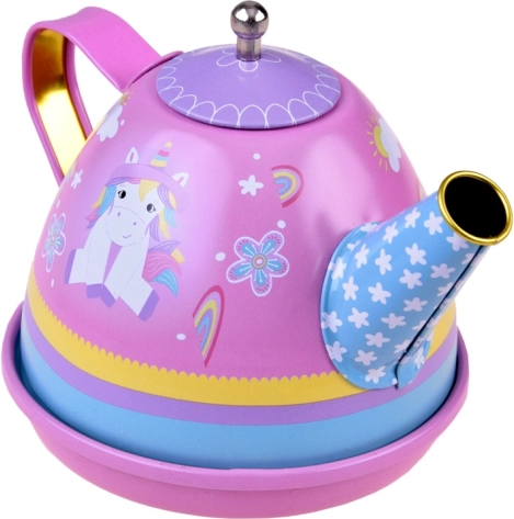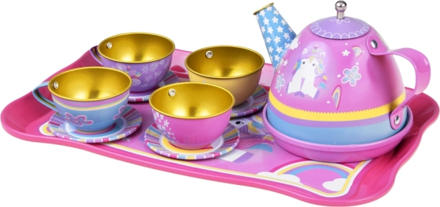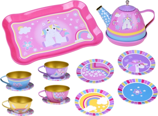 Prisrčen otroški čajni set z motivom samoroga bo razveselil vsako malo gostiteljico. Vsebuje kovinski čajnik s pokrovom, pladenj, 4 skodelice, 4 krožničke in 4 krožnike. Zahvaljujoč trdni kovinski izdelavi je odporen in varen za igro. Idealen za igro kavarnice, popoldanski čaj s prijatelji ter razvoj domišljije in socialnih veščin.