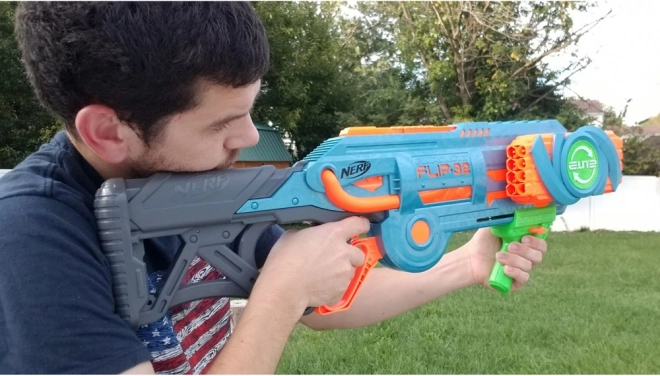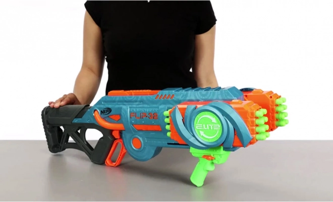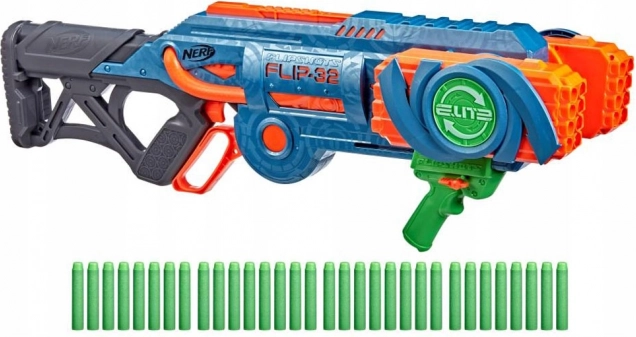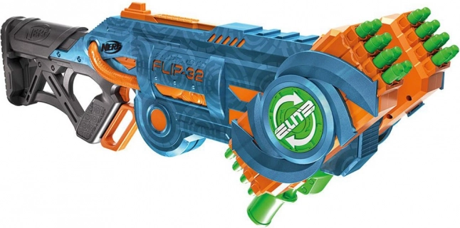 Blaster Nerf Elite 2.0 Flip-32 je izdelan iz kakovostne plastike in streli so iz varne pene z gumijastimi konci. Sistem vrtljivih nabojnikov omogoča fleksibilnost in nadaljevanje igre tudi po izstrelitvi prve serije strelov. Dovolj je obrniti nabojnik za 180 stopinj in zabava se lahko nadaljuje. Dve možnosti streljanja ponujata bodisi posamezne strele ali dvojne salvome.