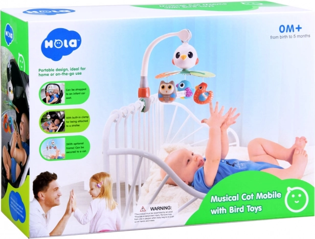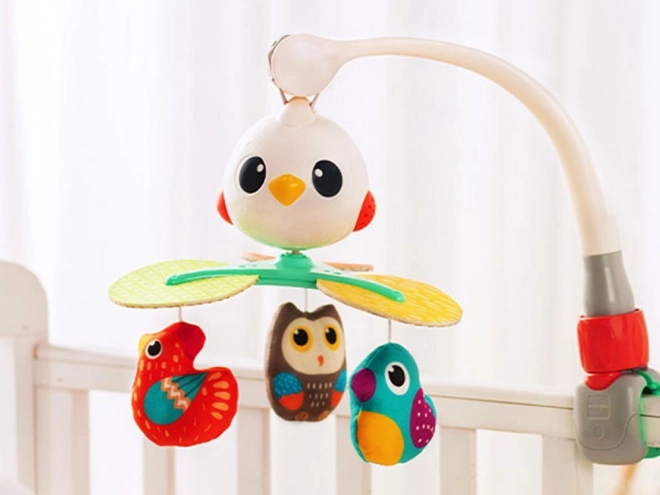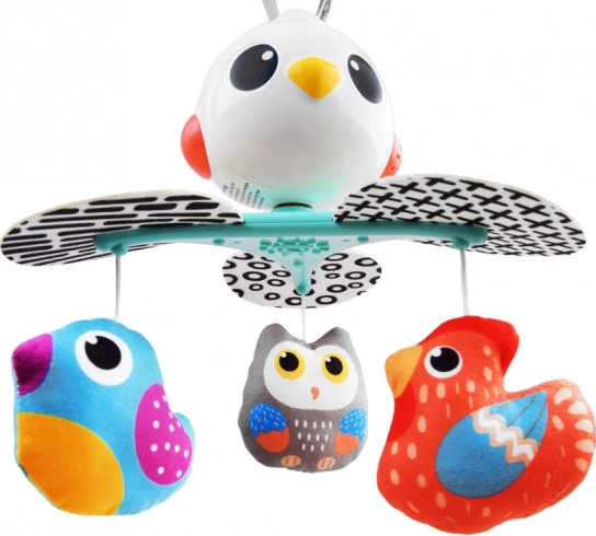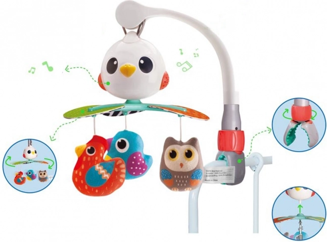 Ta čudovit otroški vrtiljak je zasnovan za spodbujanje vizualnih, slušnih in tipnih čutov vašega otroka. Preizkušene pesmi in prijetne melodije poskrbijo, da bo dojenček zadovoljen in umirjen. Vrteča se struktura je dopolnjena z visečimi igračami v obliki pisanih ptičkov, ki vabijo k prijemanju in dotikanju.