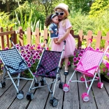 Praktična zasnova z dvojnimi vrtljivimi kolesi omogoča gladko manevriranje po različnih podlagah. Stajliš tekstil doda igri pridih šarma, voziček pa se odlično poda k vsaki otroški opremi.