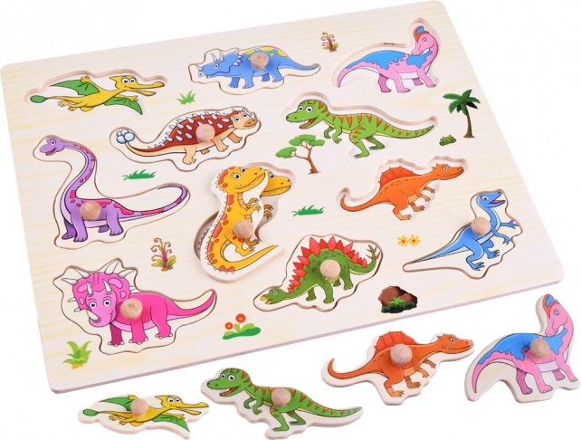 Vstavljanka je idealna za prvo spoznavanje s sestavljankami – trdna lesena plošča drži vse dele skupaj, jasno določene oblike pa vodijo do uspeha. Na plošči je skupno 11 dinozavrov, med njimi priljubljeni, kot so T‑Rex, triceratops in stegozaver.