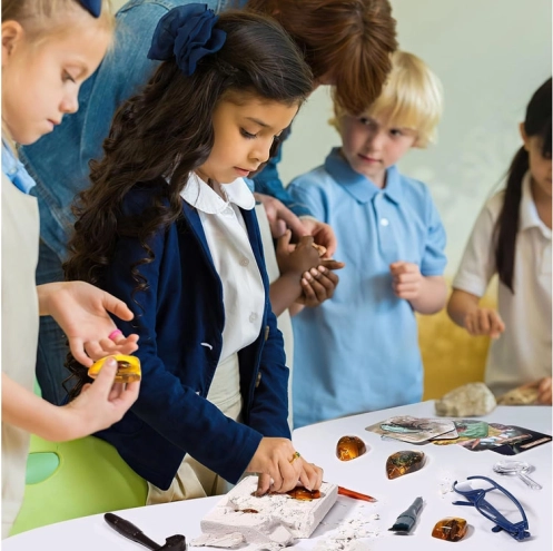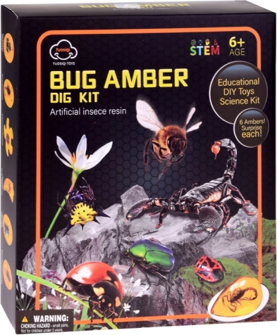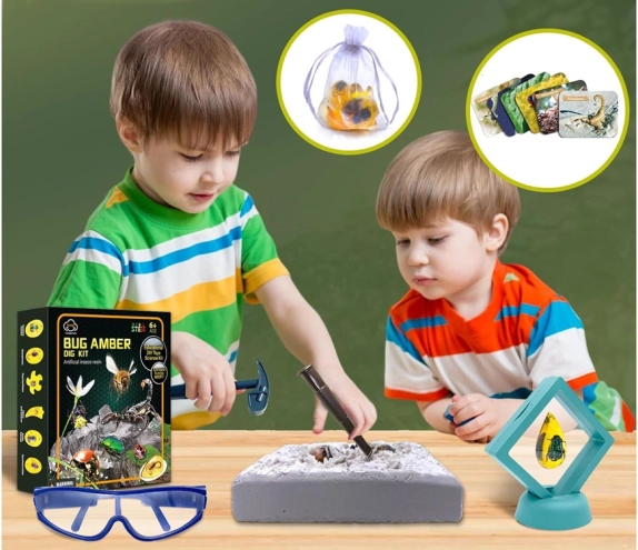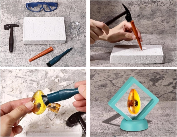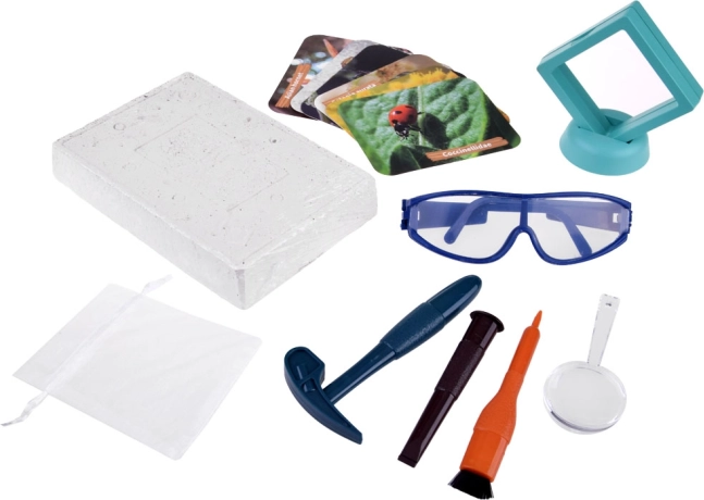Spremenite otroško sobo v majhno paleontološko delavnico. V mavčnem odlitku je skritih 6 »kosov jantarja« z ujeto žuželko, ki jih otrok korak za korakom odkrije s pomočjo kladivca, dleta in čopiča. Za varnost skrbijo zaščitna očala, za podrobno raziskovanje pa služi lupa.